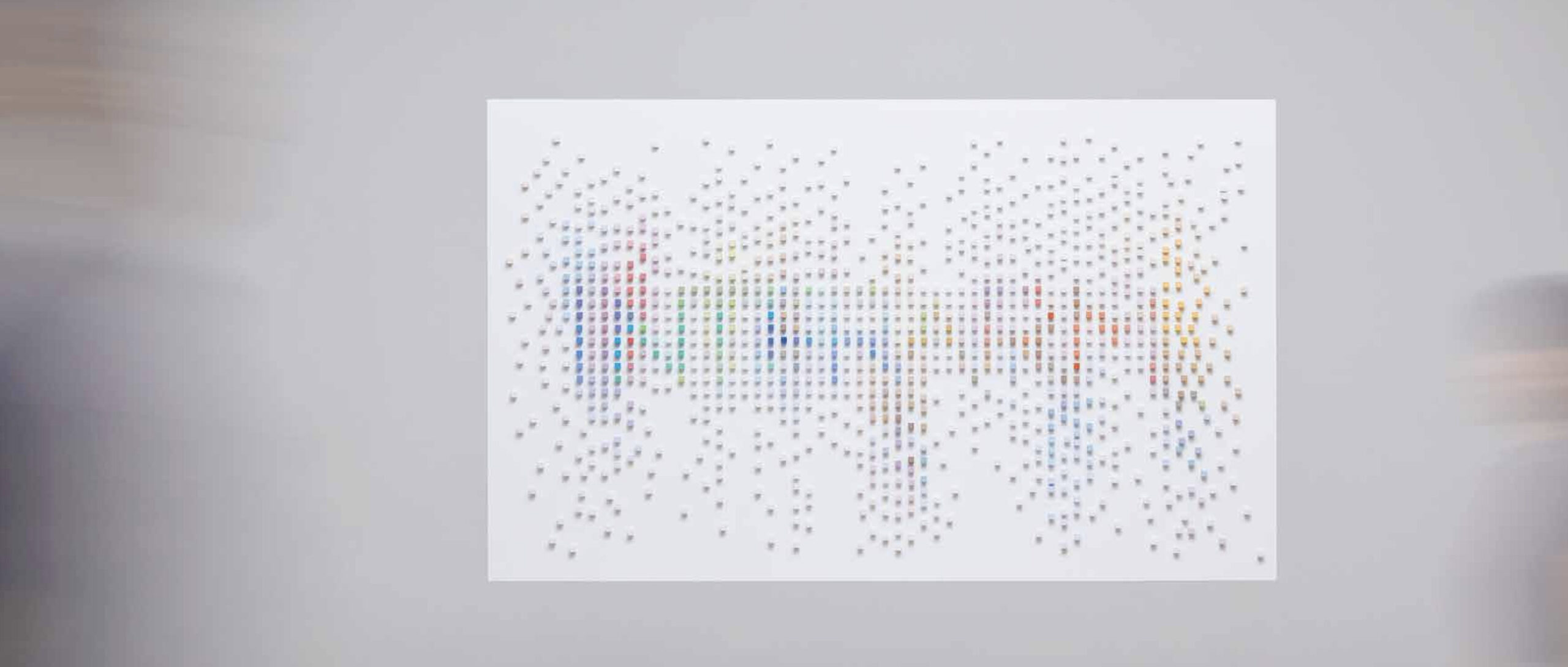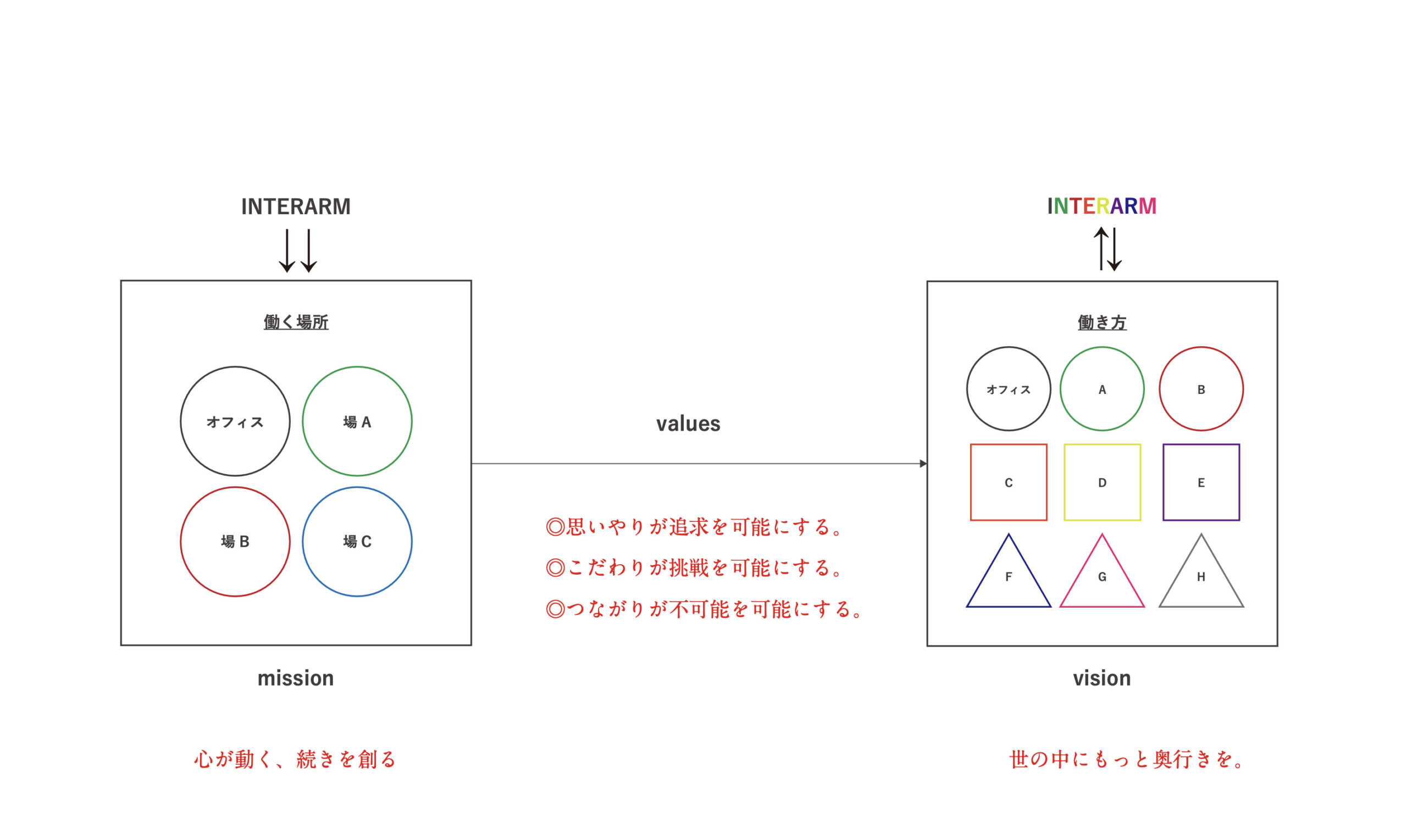 コンセプトブックには、策定したMVVと、それを形にした施工事例写真、そして社員が自社の特徴を語る対談記事を載せ、すべてがMVVとの繋がりを感じられる内容とした。特徴的なのは、ミッションを表現するアートをつくりその写真を掲載したこと。象徴的なそのページは、読む人に意味を考えさせ、面白そうな会社だと興味をひく狙いもある。お客様の繋がりのあるアーティストに依頼するなど、今回のPJそのものがお客様らしい”繋がり”を大切にした進め方であり、形になったブックやアートからだけでなく、プロセスを含めインターアームらしさが再認識できるPJとなった。