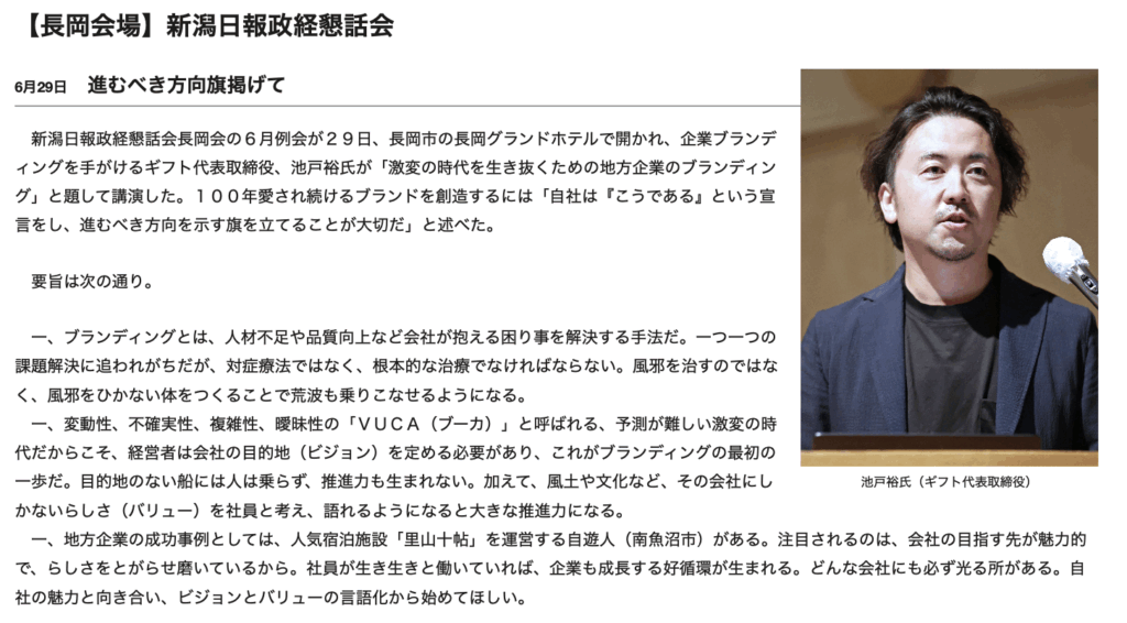 新潟日報社が主催されている、新潟日報政経懇話会の長岡会、6月例会に講師として登壇させていただきました。激変の時代を生き抜くための、地方企業のブランディングをテーマに講演。ビジョンや理念の意義や旗を掲げることの価値についてお話をさせていただきました。